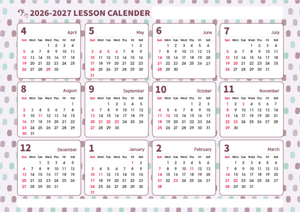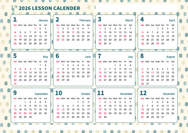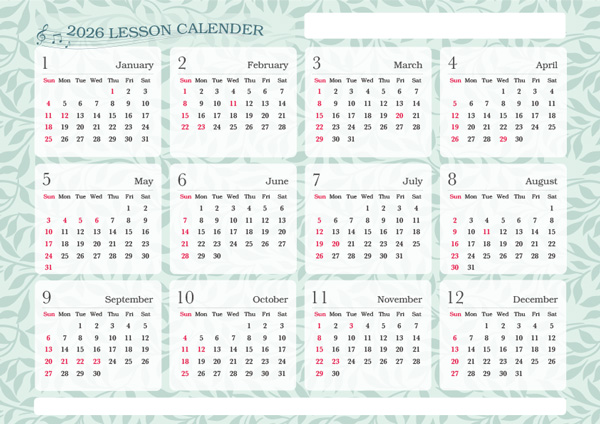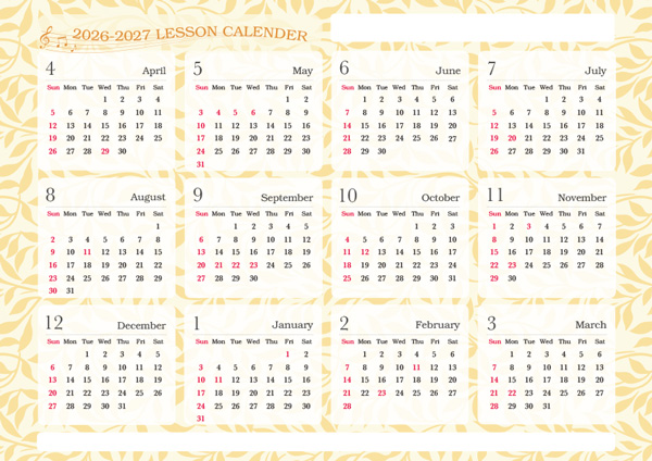 手帳に挟んだりレッスン室に掲示するほか、印を付けて生徒さんにレッスン日を伝えるためのお役立ちアイテムとしてお使いください。1月始まりと4月始まり、それぞれデザイン2種からお選びいただけます。