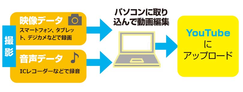 スマホのみで撮影~アップロードを行うのが簡単ですが、音質面を考えるとベストではありません。ここからの解説では、映像/音声/動画を以下と考えて説明していきます。