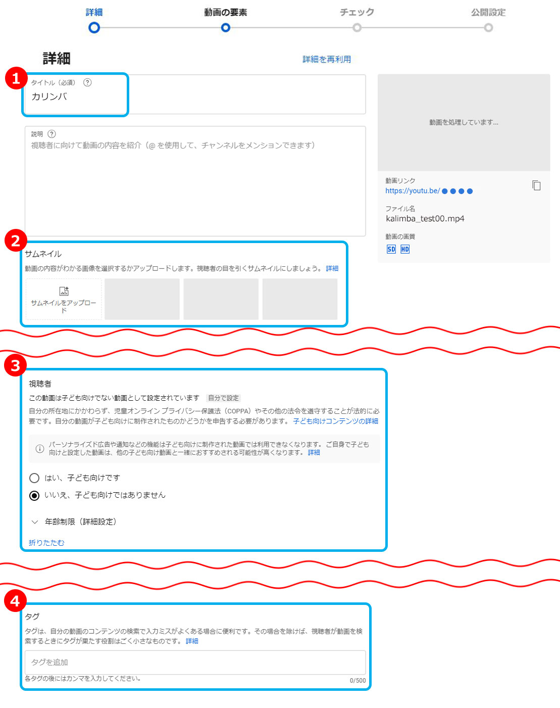 アップロードを行うと、画面が以下のように切り替わります。視聴数にもつながる大事な工程なので、ぜひよく読んで自分なりにアレンジを加えましょう。